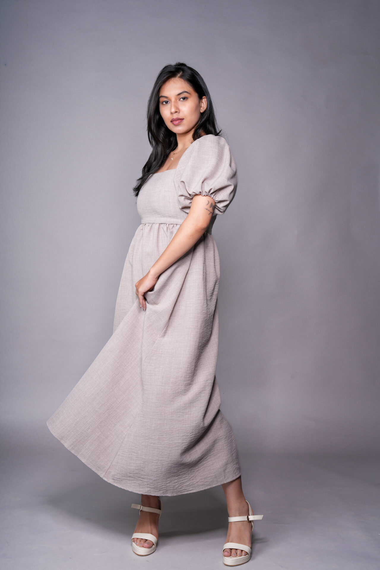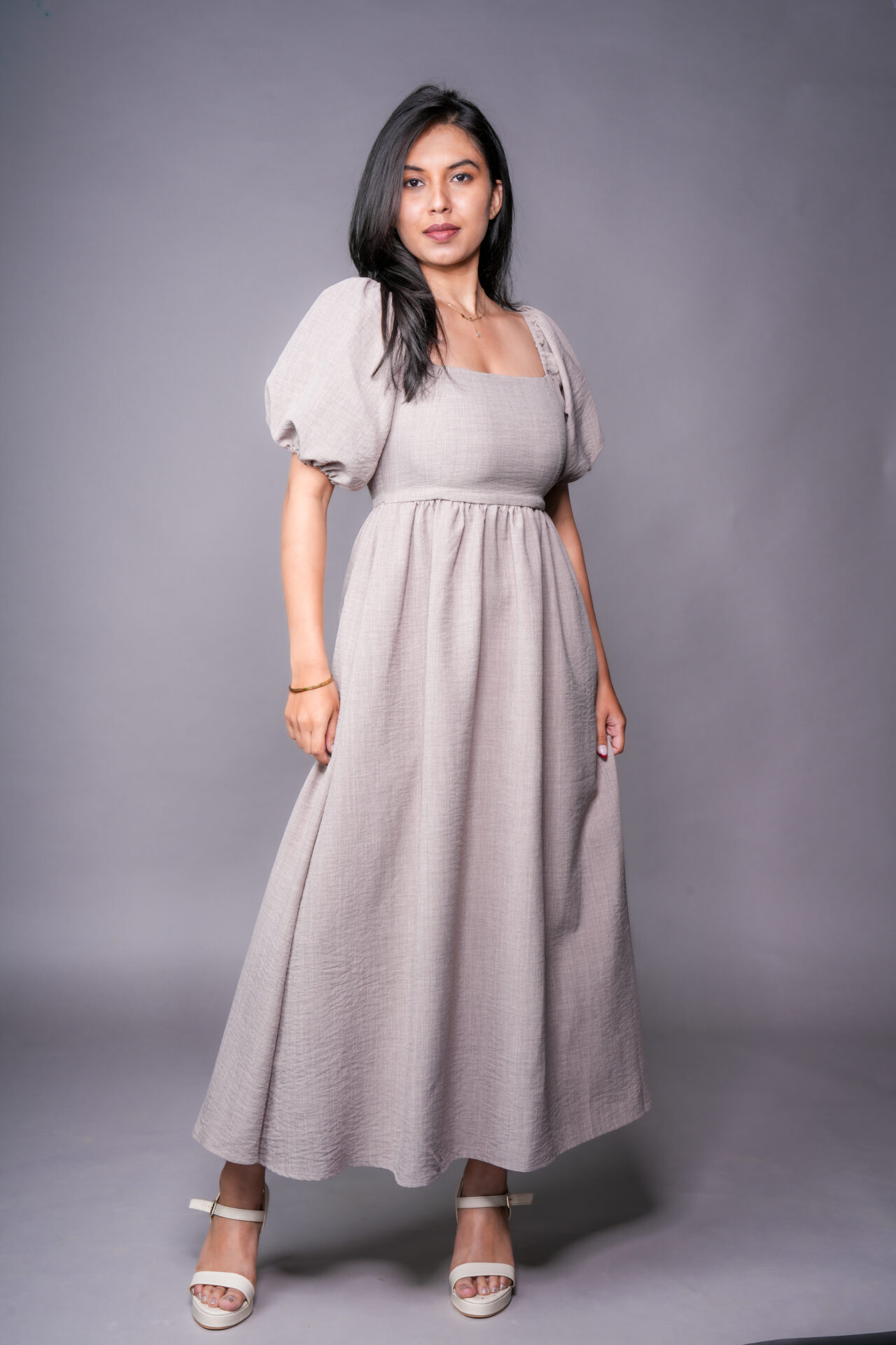 Minimal, graceful, and quietly stylish, the Ava Dress is designed for effortless elegance.Featuring a flattering square neckline, soft puff sleeves, and a gently gathered waist that flows into a relaxed maxi silhouette, it offers comfort without compromising on style.